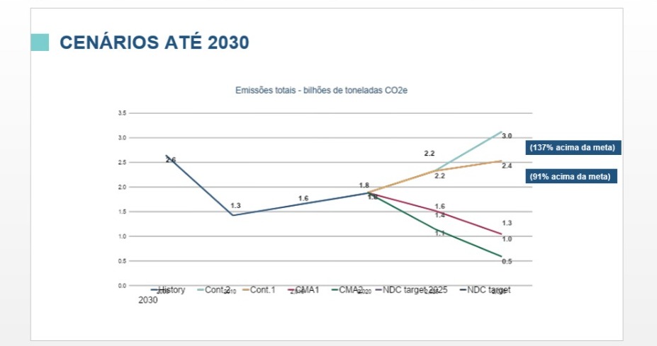 Em ambos os cenários, os cálculos mostram que as políticas públicas adotadas no período de 2019 a 2022 e a falta de ações efetivas levam à retomada do crescimento das emissões de GEE. Desta forma, acontece o não cumprimento dos compromissos assumidos pelo Brasil no Acordo de Paris - 37% de redução das emissões totais do país até 2025 e 50% até 2030, com relação ao nível de 2005, de 2,6 Gt (bilhões de toneladas) de CO2eq - e o aumento das emissões para muito além da meta.