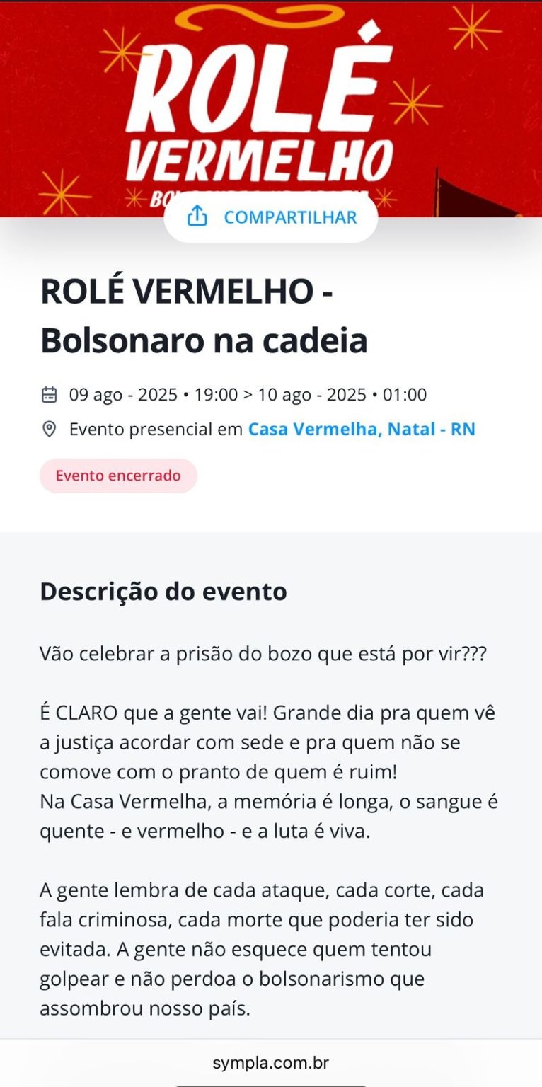 No Instagram da Casa Vermelha, os posts chamavam a população para “comemorar a prisão” e exaltavam a luta contra o bolsonarismo, com textos em tom de mobilização ideológica. Já na página de venda de ingressos no Sympla, a descrição do evento falava expressamente em “celebrar as instituições democráticas” e “entrar na regressiva para Bolsonaro na cadeia”, deixando claro que não se tratava apenas de uma festa cultural, mas de um ato político.